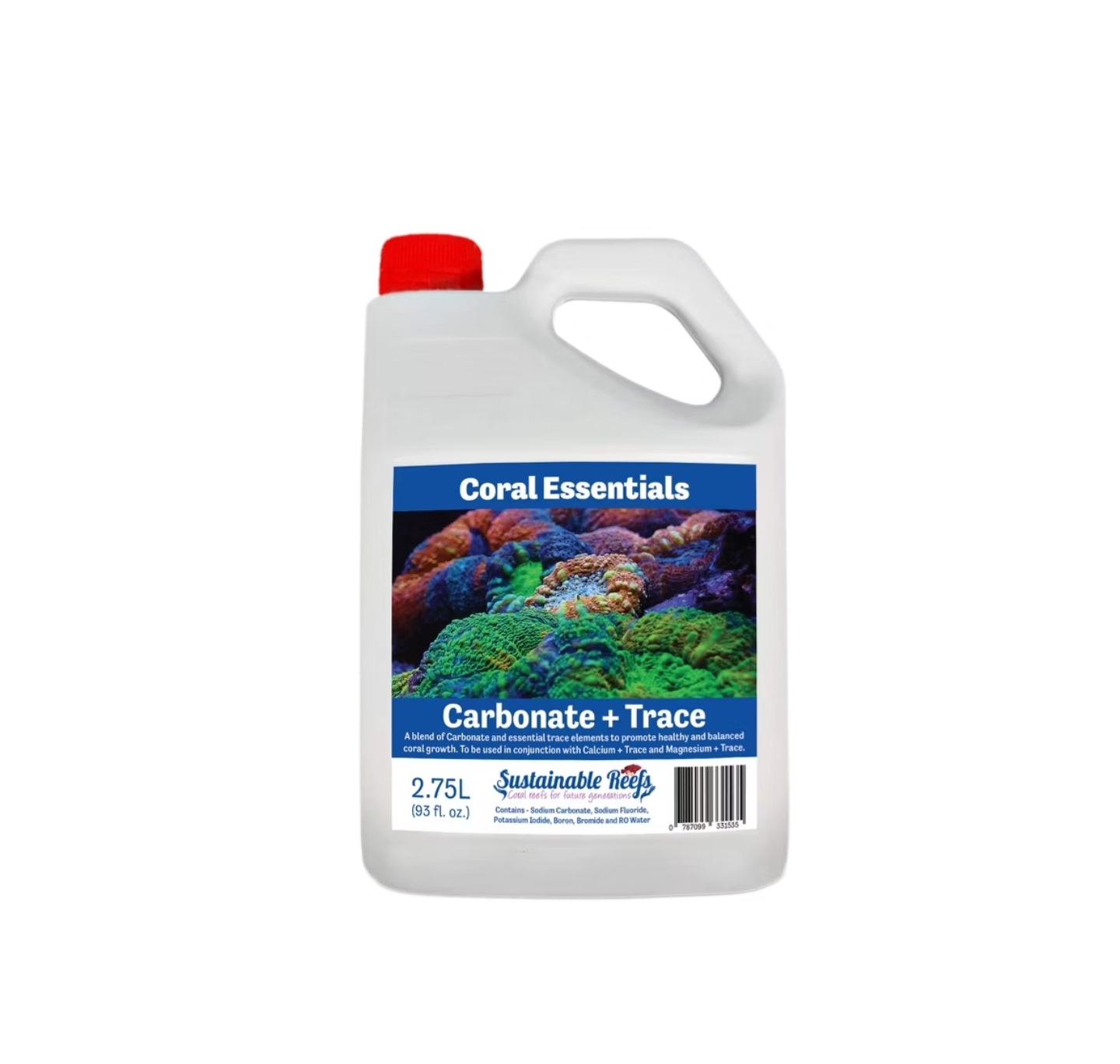 Carbonate + Trace es una fuente concentrada de carbonato líquido, 180.000 ppm (mg/L) o 10.000 dKH y nuestra propia mezcla única de oligoelementos. Hemos añadido nuestros elementos Coral Power Trace C, así como Boro y Bromuro a esta mezcla utilizando nuestro régimen de dosificación probado Coral Essentials Method. Cuando se utiliza Carbonate + Trace no es necesario añadir oligoelementos adicionales.