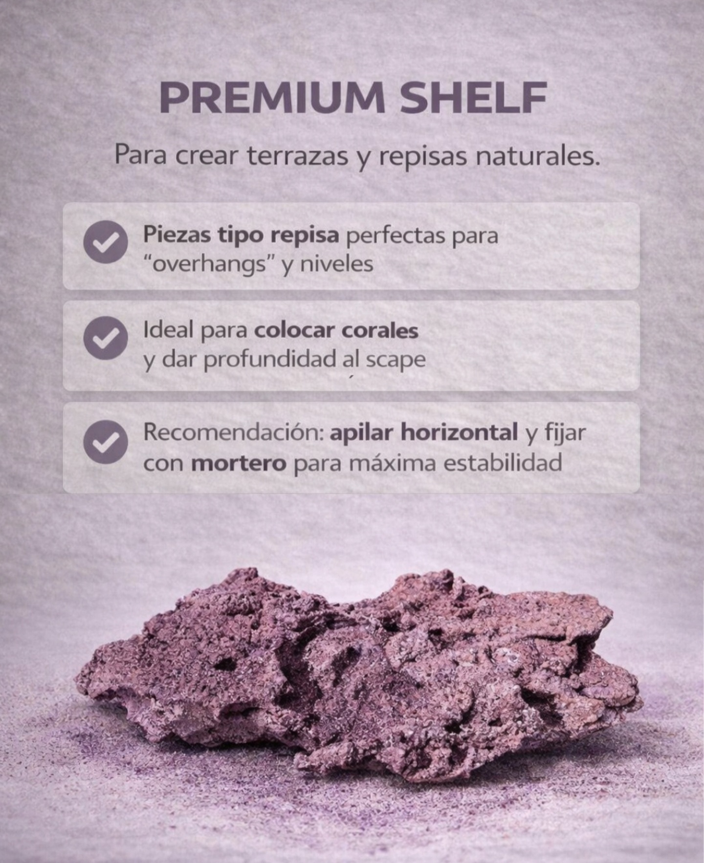 Cada roca es única y puede usarse para formar fantásticas estructuras de plataformas y cuevas en las que puedes colocar tus corales o en las que tus peces pueden esconderse.
