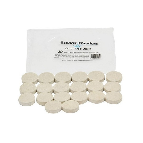20 discos blancos de aragonita de la marca Ocean Wonders aptos para la fragmentación y propagación de corales. Favorecen el crecimiento coralino.